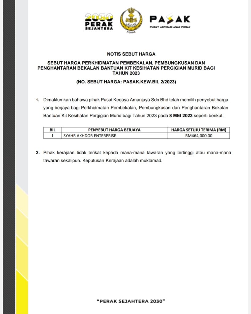 NOTIS SEBUT HARGASEBUT HARGA PERKHIDMATAN PEMBEKALAN, PEMBUNGKUSAN DAN PENGHANTARAN BEKALAN BANTUAN KIT KESIHATAN PERGIGIAN MURID BAGI TAHUN 2023 (NO. SEBUT HARGA: PASAK.KEW.BIL 2/2023)Dimaklumkan bahawa pihak Pusat Kerjaya Amanjaya Sdn Bhd telah memilih penyebut harga yang berjaya bagi Perkhidmatan Pembekalan, Pembungkusan dan Penghantaran Bekalan Bantuan Kit Kesihatan Pergigian Murid bagi Tahun 2023 pada 8 MEI 2023 seperti […]