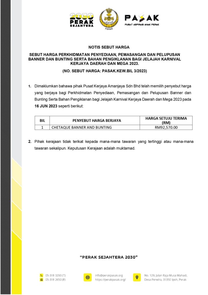 NOTIS SEBUT HARGA SEBUT HARGA PERKHIDMATAN PENYEDIAAN, PEMASANGAN DAN PELUPUSAN BANNER DAN BUNTING SERTA BAHAN PENGIKLANAN BAGI JELAJAH KARNIVAL KERJAYA DAERAH DAN MEGA 2023.