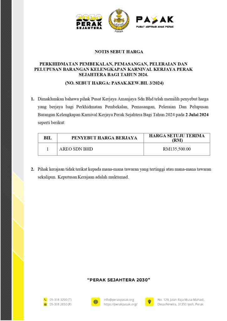 NOTIS SEBUT HARGA PERKHIDMATAN PEMBEKALAN, PEMASANGAN, PELERAIAN DAN PELUPUSAN BARANGAN KELENGKAPAN KARNIVAL KERJAYA PERAK SEJAHTERA BAGI TAHUN 2024. (NO. SEBUT HARGA: PASAK.KEW.BIL 3/2024) 1. Dimaklumkan bahawa pihak Pusat Kerjaya Amanjaya Sdn Bhd telah memilih penyebut harga yang berjaya bagi Perkhidmatan Pembekalan, Pemasangan, Peleraian Dan Pelupusan Barangan Kelengkapan Karnival Kerjaya Perak Sejahtera Bagi Tahun 2024 pada […]