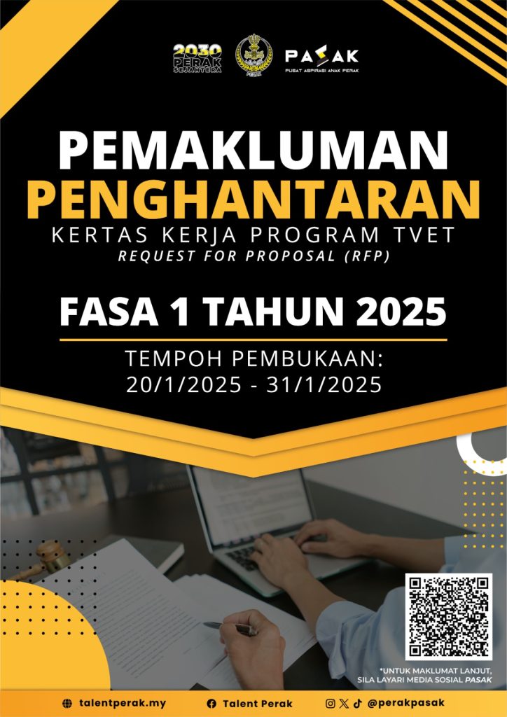 Dimaklumkan bahawa semua penyedia latihan yang berminat dan berkelayakan dijemput untuk menghantar kertas kerja bagi Program TVET Fasa 1 Tahun 2025.ย Tempoh penghantaran: 20 Januari – 31 Januari 2025Semua RFP perlu dihantar mengikut format dan garis panduan yang ditetapkan.ย Untuk sebarang pertanyaan atau maklumat lanjut, sila hubungi Cik Asyikin atau Cik Jannah di 05-318 3290.ย ย