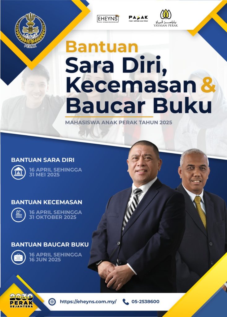 Kerajaan Negeri Perak melalui Pejabat YB Pengerusi Jawatankuasa Pendidikan, Pengajian Tinggi, Belia & Sukan Negeri Perak meneruskan inisiatif untuk Mahasiswa Anak Perak melalui Bantuan Sara Diri & Kecemasan Mahasiswa dan Bantuan Baucar Buku Mahasiswa Tahun 2025.Β Layari www.eheyns.com.my