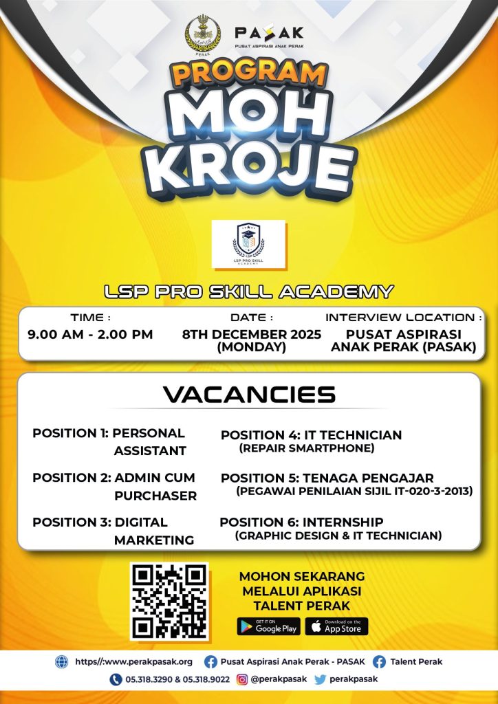 𝗞𝗘𝗥𝗝𝗔 𝗞𝗢𝗦𝗢𝗡𝗚 𝗗𝗜 𝗣𝗘𝗥𝗔𝗞 Jom datang temu duga terbuka bersama LSP Pro Skill AcademyPROGRAM MOH KROJE Tarikh: 8 Disember 2025 (Isnin) Masa: 9.00 pagi – 2.00 petang Lokasi Temu Duga: Bangunan Pusat Aspirasi Anak Perak (PASAK) Daftar kehadiran anda sekarang di Talent Perak: Google Play Store: https://play.google.com/store/apps/details… App Store: https://apps.apple.com/app/talent-perak/id1658234492 Untuk maklumat lanjut: https://whatsapp.com/channel/0029Vb6bm4qFi8xdWRFLmB0D https://t.me/perakpasak Pertanyaan? DM je […]