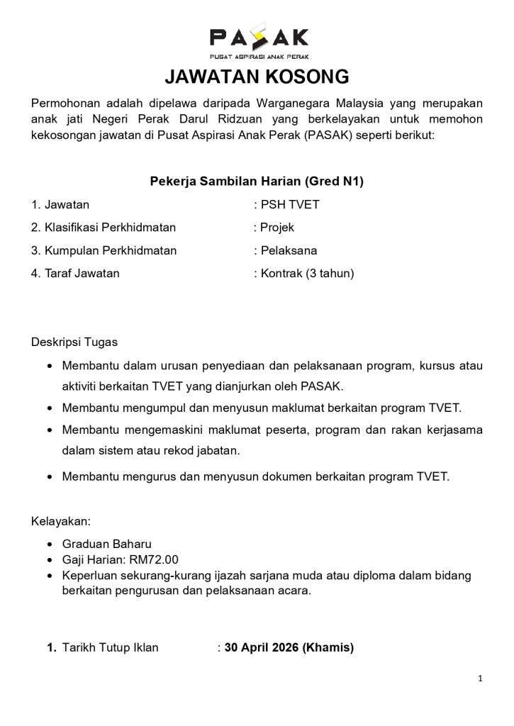 Pusat Aspirasi Anak Perak (PASAK) mempelawa Warganegara Malaysia khususnya anak jati Negeri Perak untuk memohon jawatan kosong Pekerja Sambilan Harian (PSH) TVET bagi menyokong pelaksanaan program latihan kemahiran dan pembangunan modal insan di Negeri Perak.Jawatan ini sangat sesuai untuk graduan yang berminat dalam pengurusan program, latihan TVET dan pembangunan belia. 💼 Maklumat Jawatan Jawatan: […]