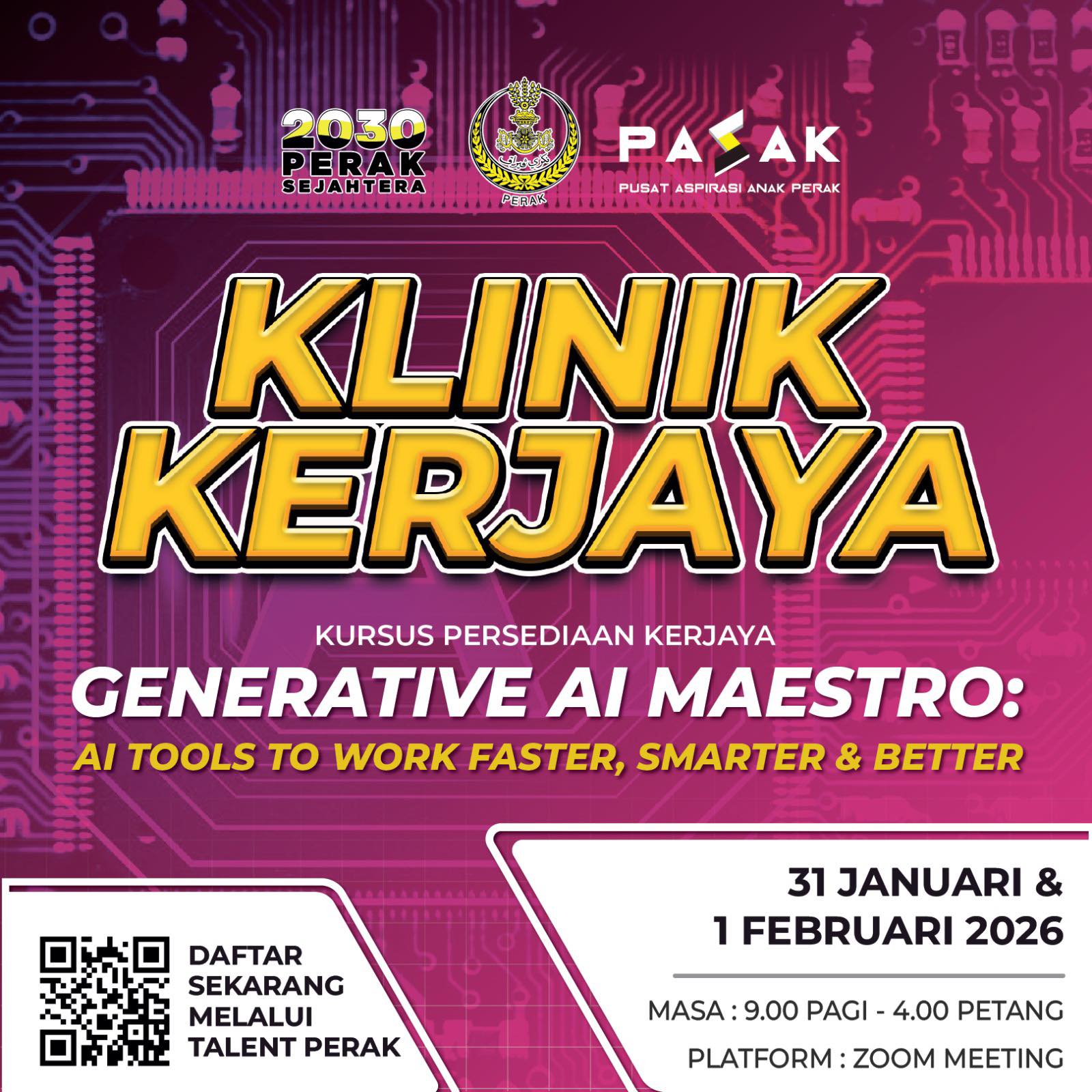 #KursusAI #GenerativeAI #LatihanAI #KlinikKerjaya #ProduktivitiKerja #KemahiranDigital #AIUntukKerjaya #PASAK #TalentPerak #LatihanAtasTalian