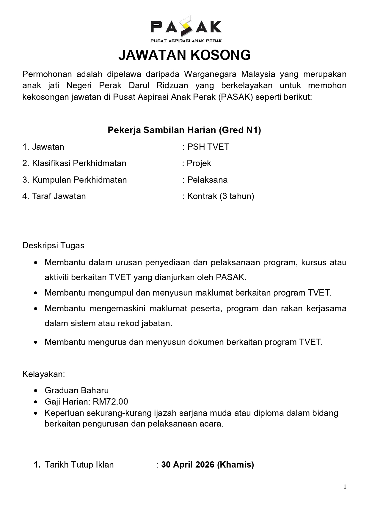 Pusat Aspirasi Anak Perak (PASAK) mempelawa Warganegara Malaysia khususnya anak jati Negeri Perak untuk memohon jawatan kosong Pekerja Sambilan Harian (PSH) TVET bagi menyokong pelaksanaan program latihan kemahiran dan pembangunan modal insan di Negeri Perak.Jawatan ini sangat sesuai untuk graduan yang berminat dalam pengurusan program, latihan TVET dan pembangunan belia.