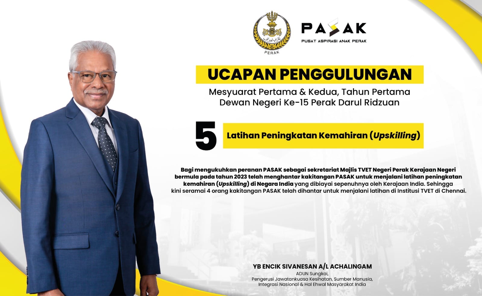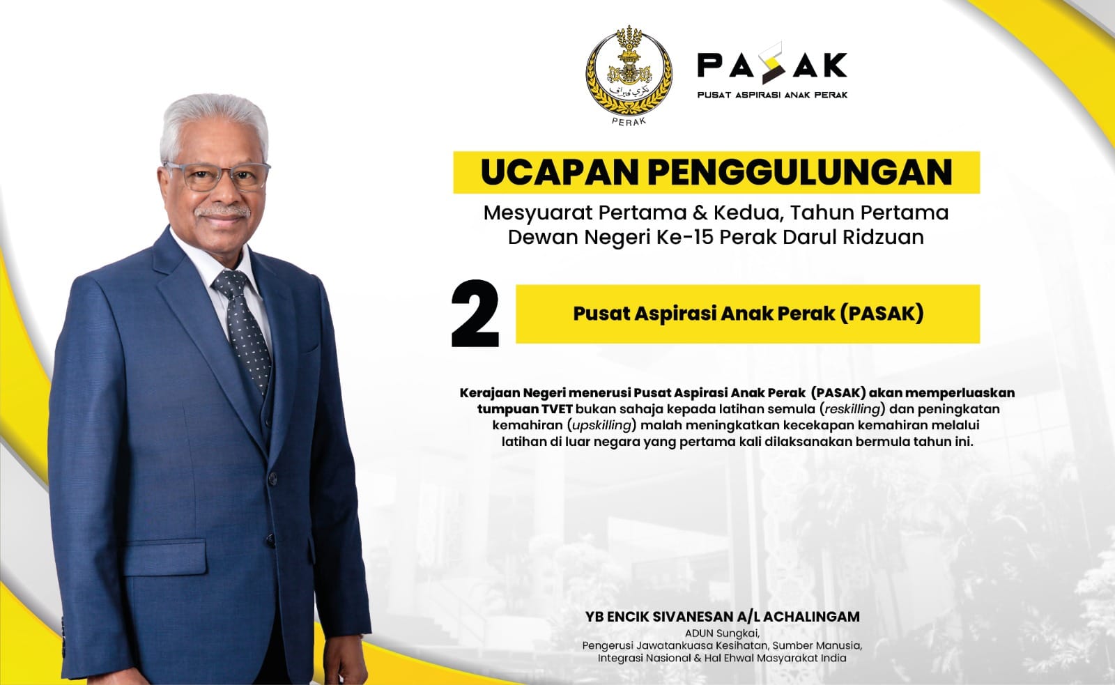 Kerajaan Negeri menerusi Pusat Aspirasi Anak Perak (PASAK) akan memperluaskan tumpuan TVET bukan sahaja kepada latihan semula (reskilling) akan peningkatan kemahiran (upskilling) malah meningkatkan kecekapan kemahiran melalui latihan di luar negara yang pertama kali dilaksanakan bermula tahun ini.