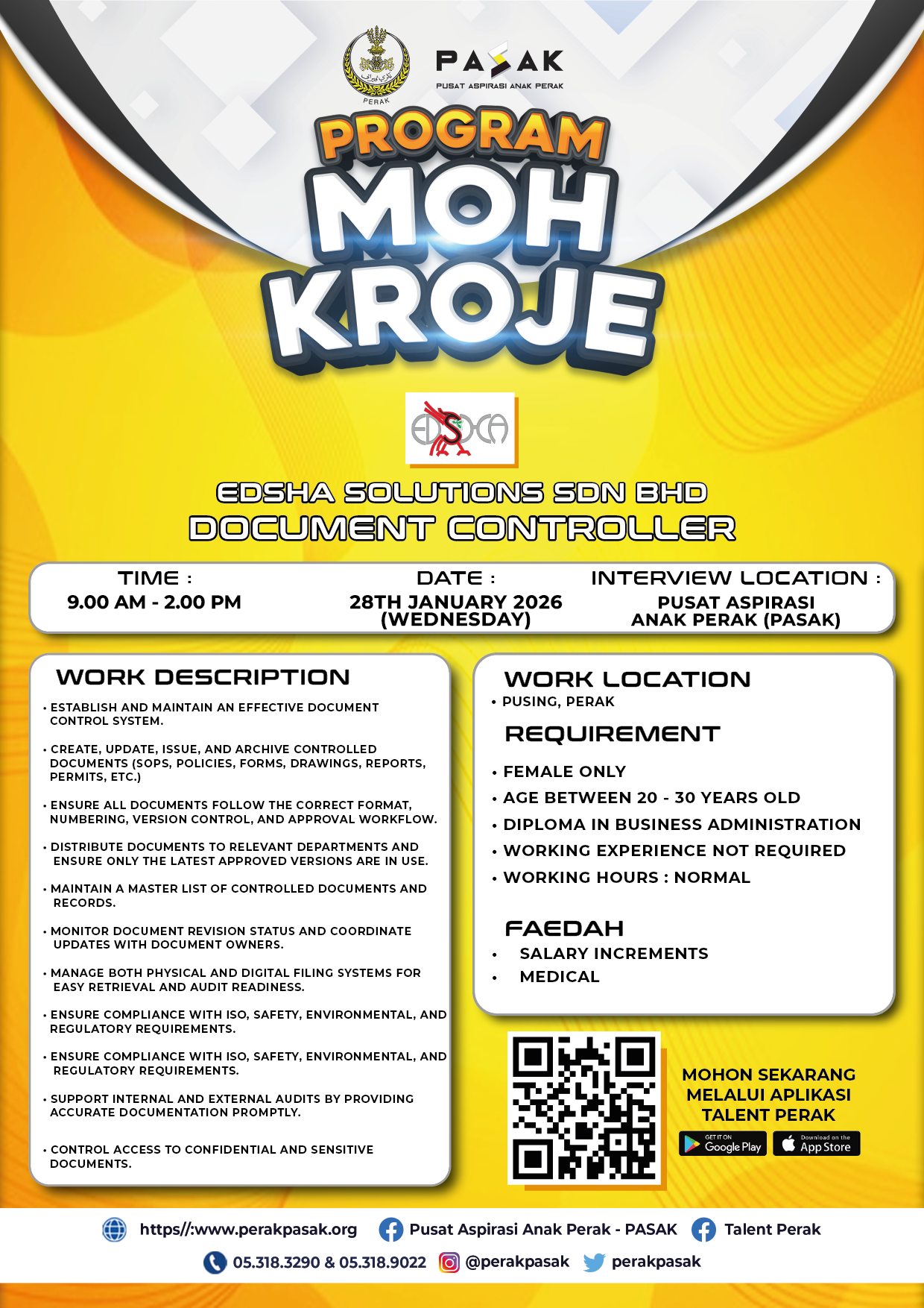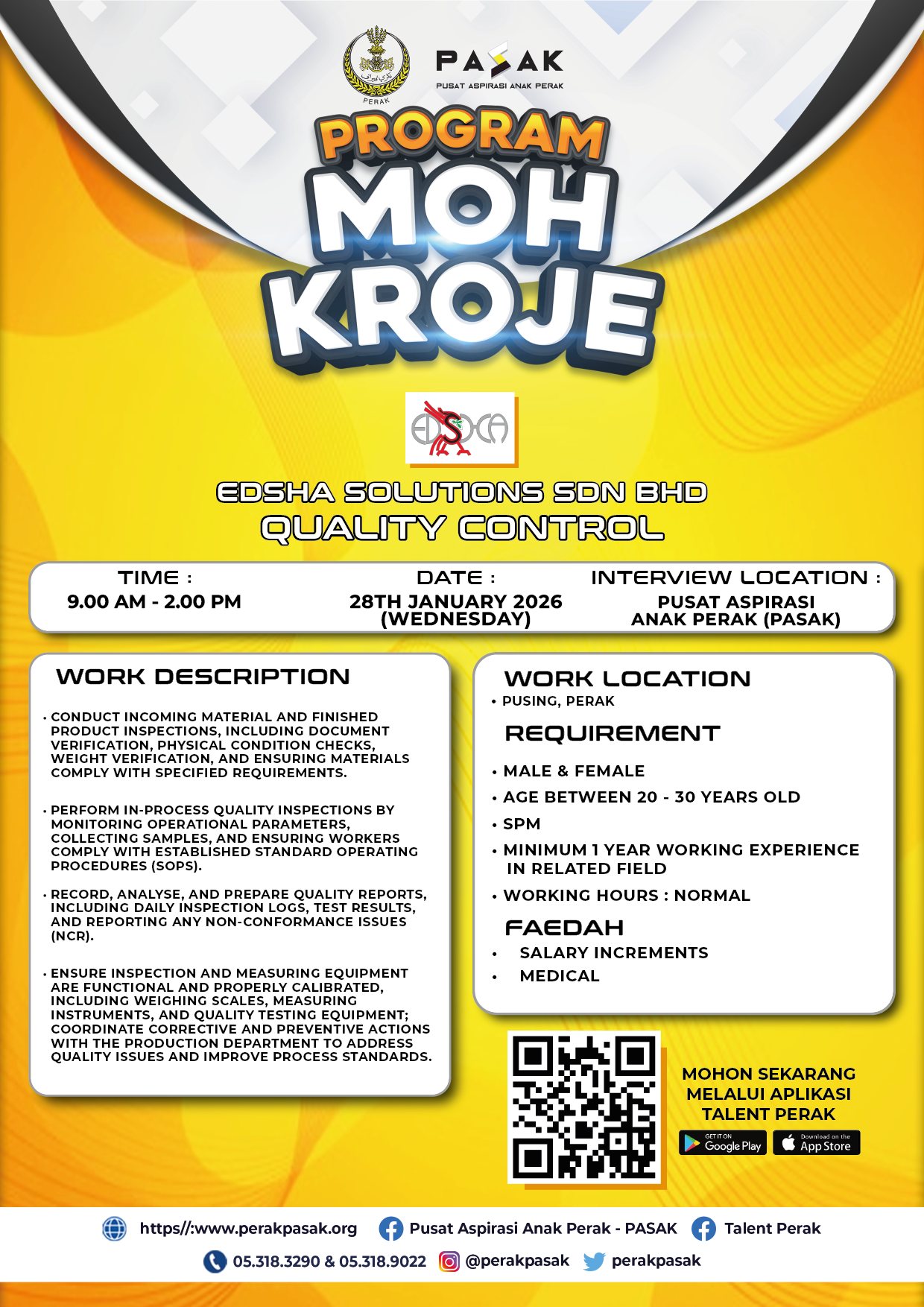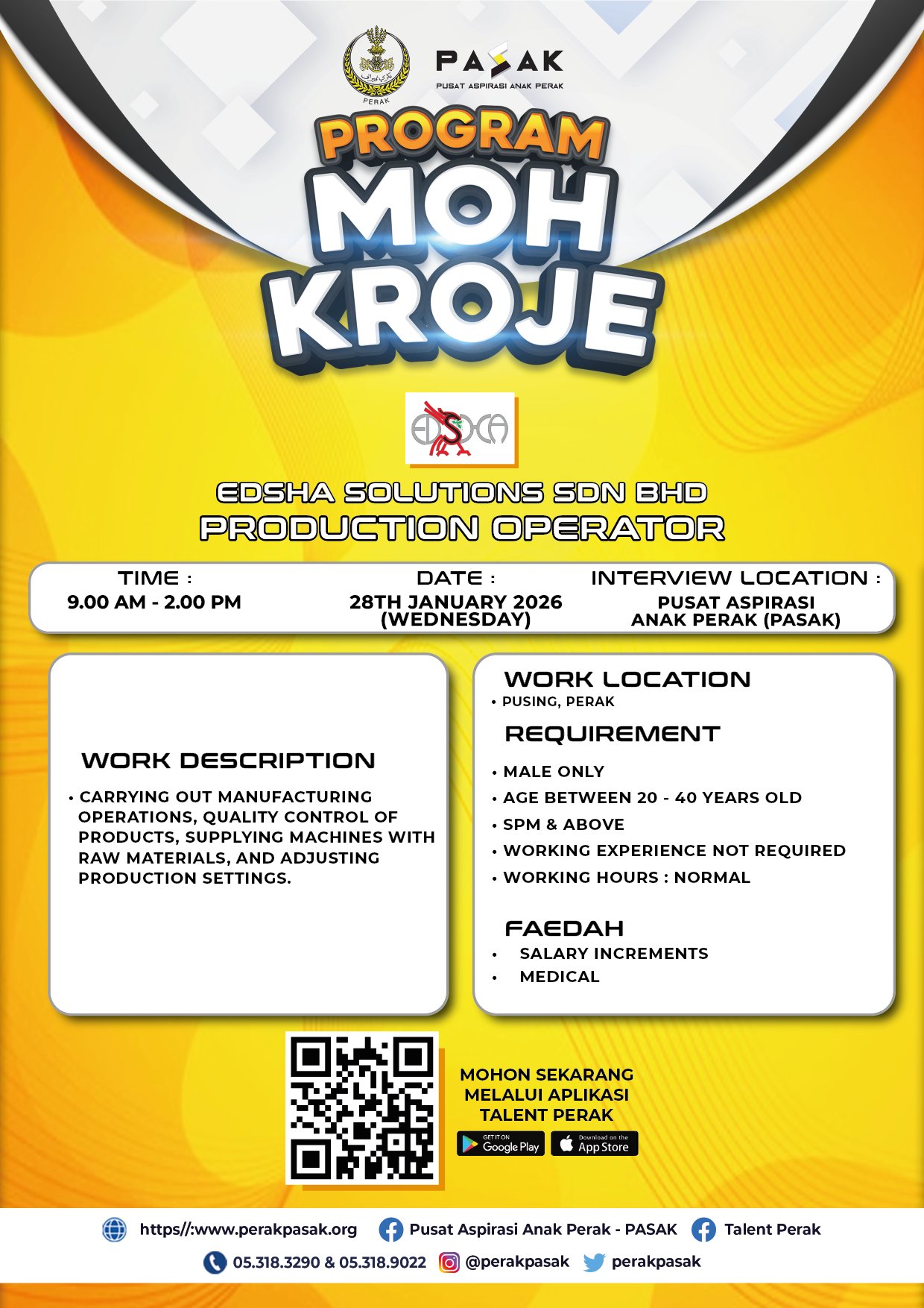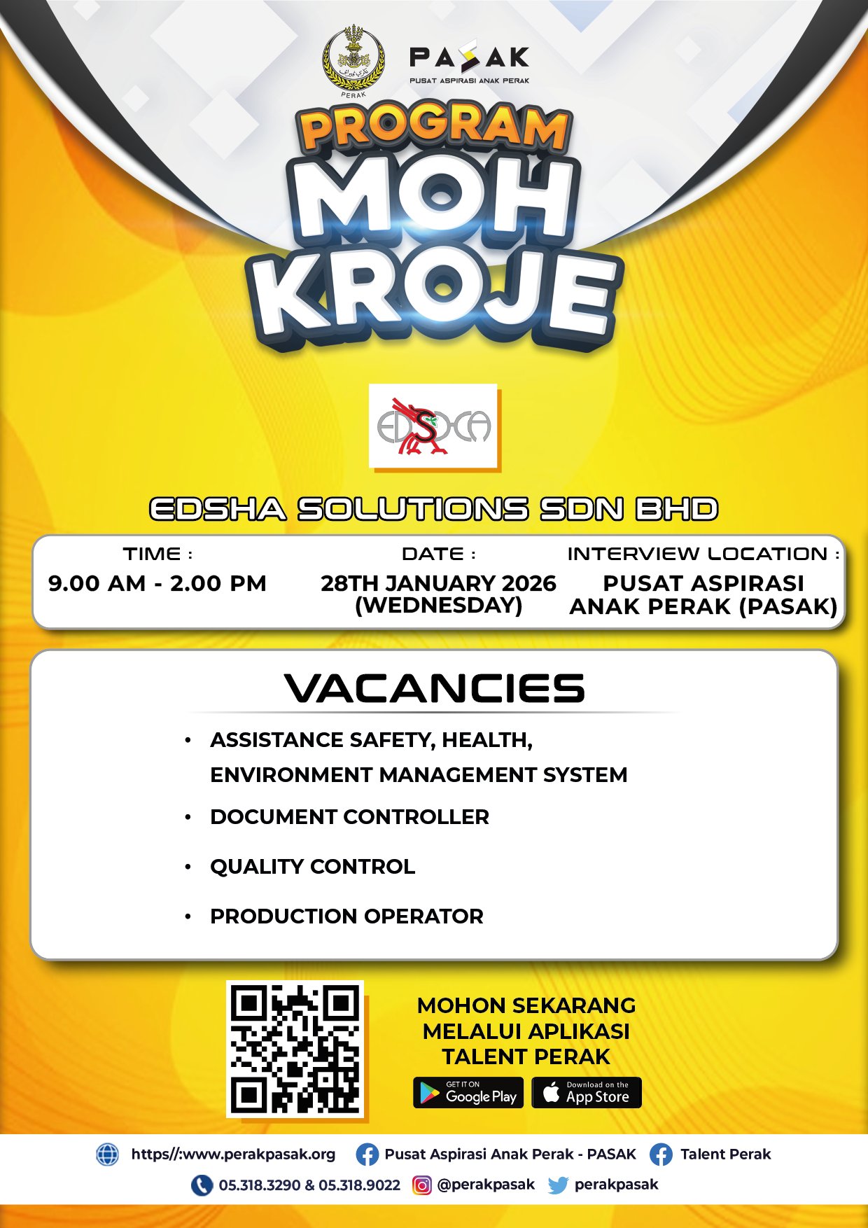 Peluang baik punya untuk orang Perak! Edsha Solutions Sdn Bhd sedang mencari pekerja baru sempena Program Moh Kroje ni.