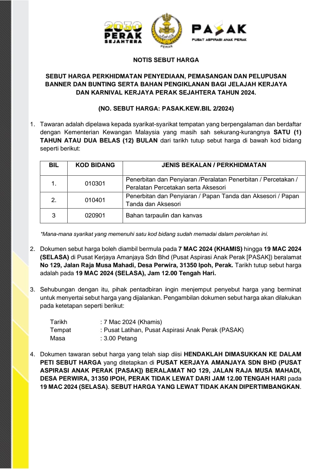 NOTIS SEBUT HARGA PERKHIDMATAN PENYEDIAAN, PEMASANGAN DAN PELUPUSAN BANNER DAN BUNTING SERTA BAHAN PENGIKLANAN BAGI JELAJAH KERJAYA DAN KARNIVAL KERJAYA PERAK SEJAHTERA TAHUN 2024.