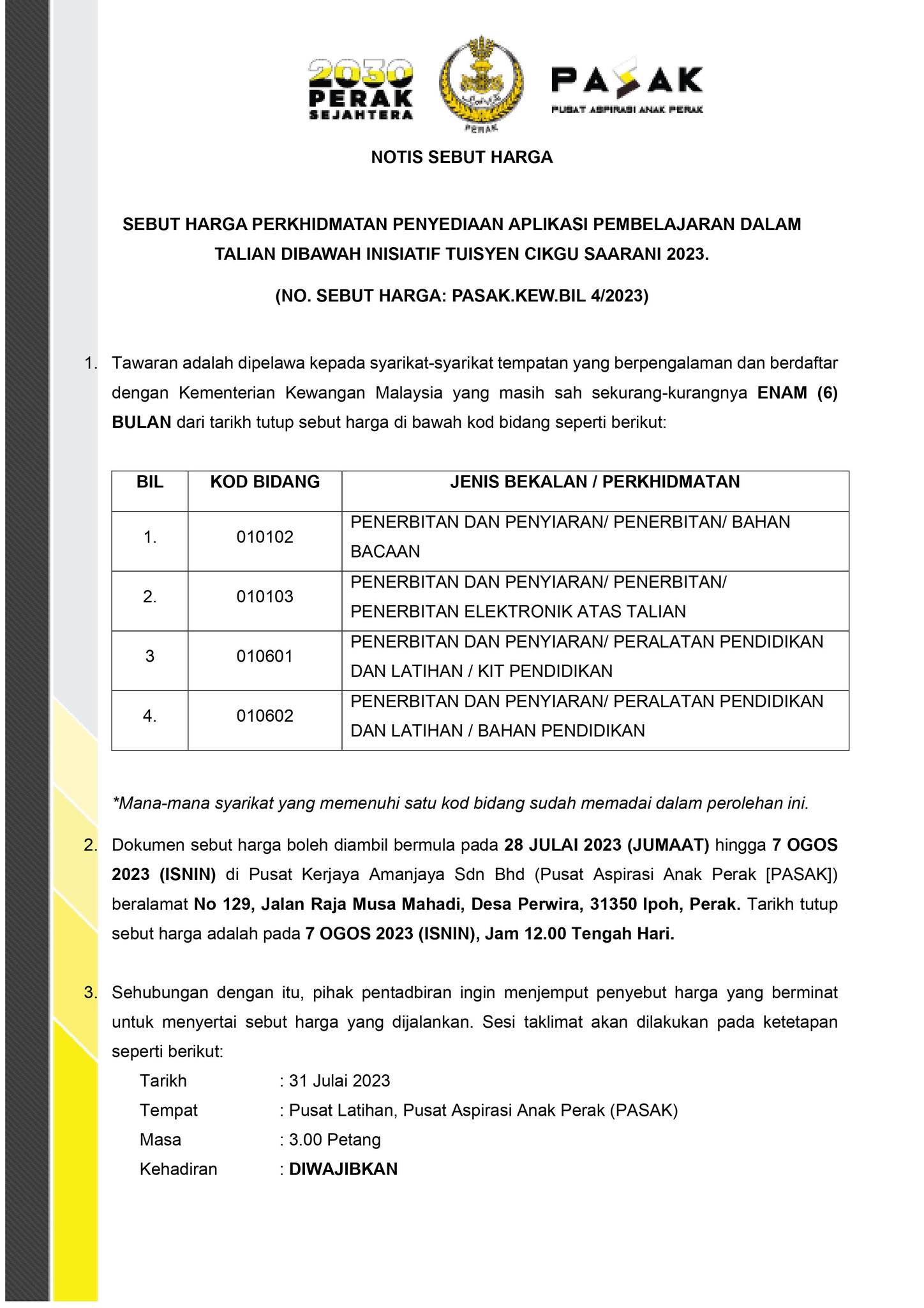 SEBUT HARGA PERKHIDMATAN PENYEDIAAN APLIKASI PEMBELAJARAN DALAM TALIAN DIBAWAH INISIATIF TUISYEN CIKGU SAARANI 2023