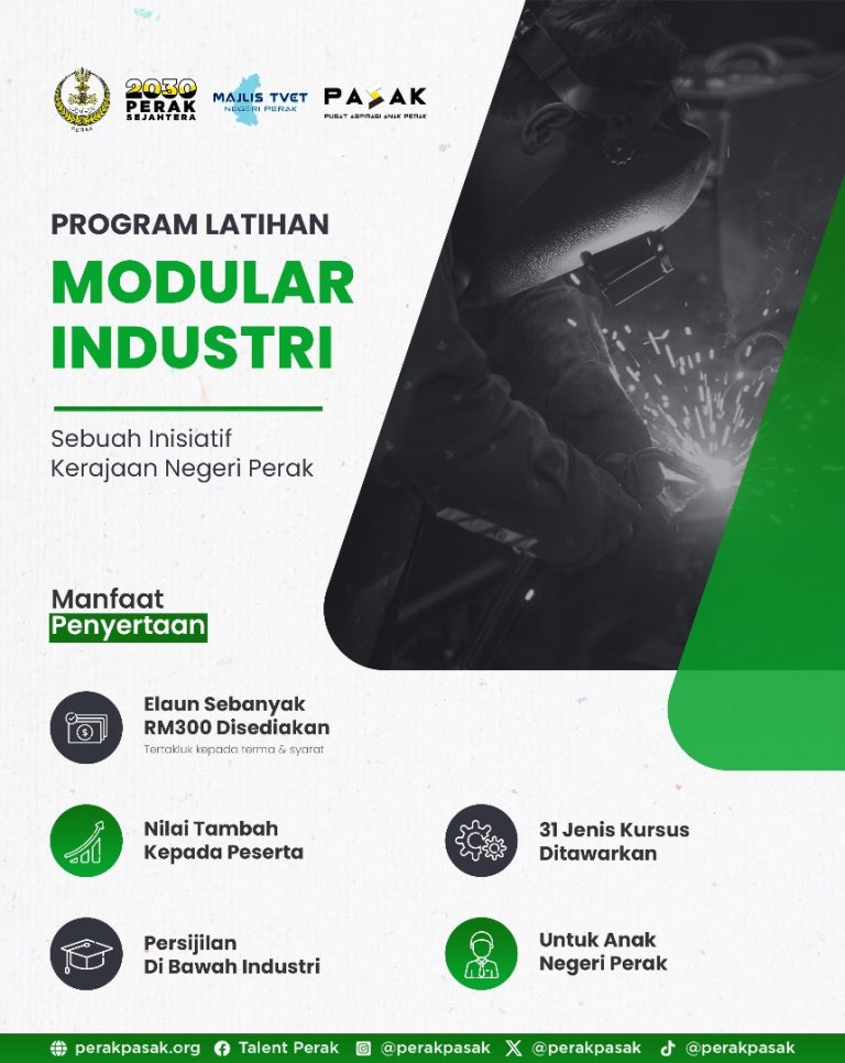 PELUANG KERJA TVET MODULAR INDUSTRI DI PERAKMoh raih peluang kerjaya di bawah Program TVET Modular Industri, satu inisiatif hebat dari Kerajaan Negeri Perak! KELEBIHAN YANG
