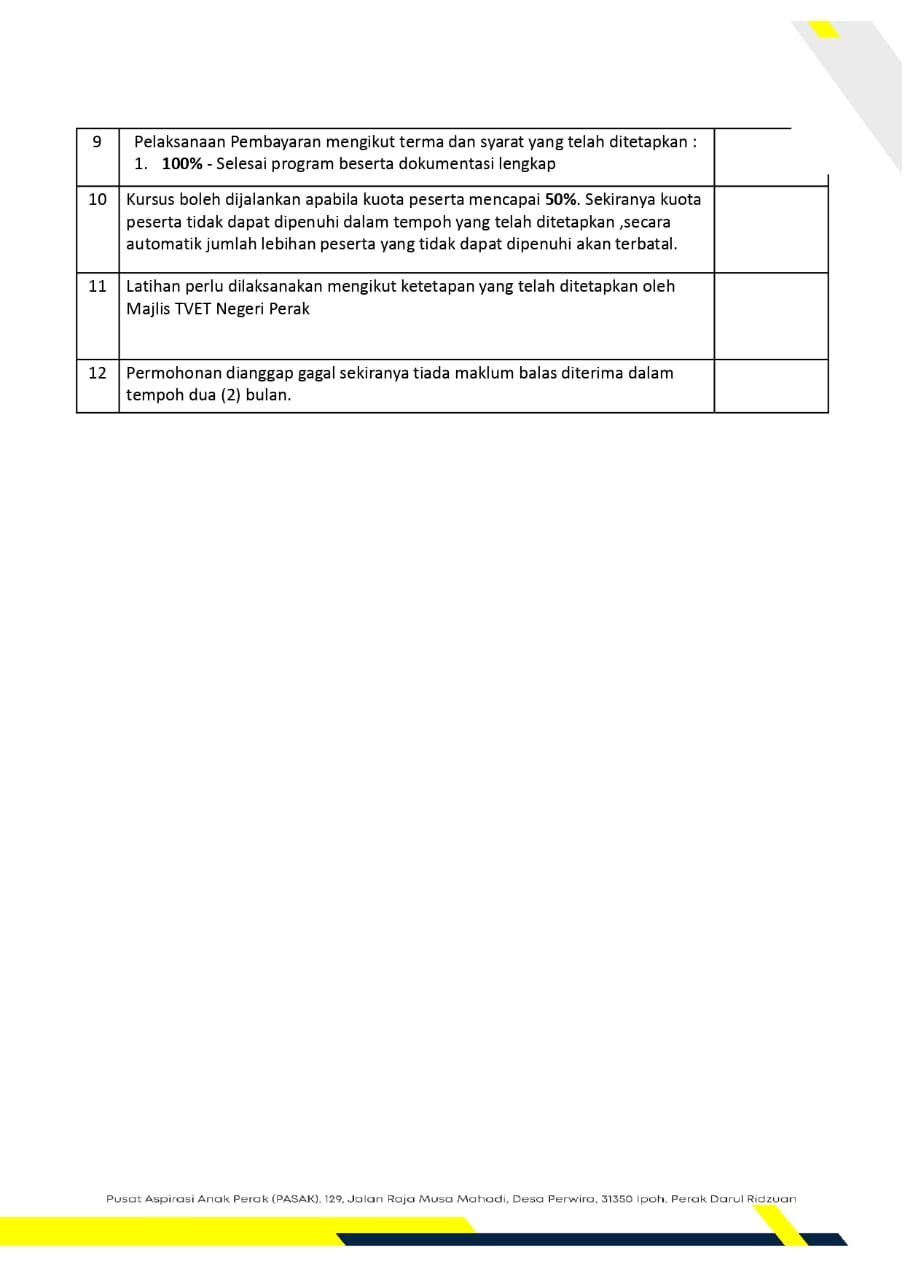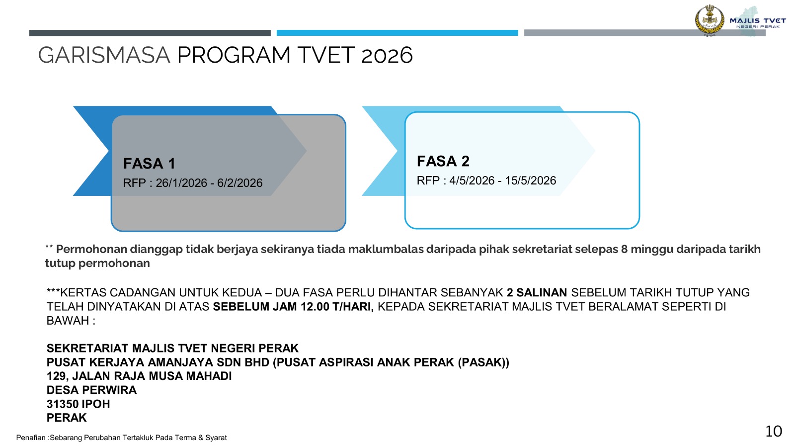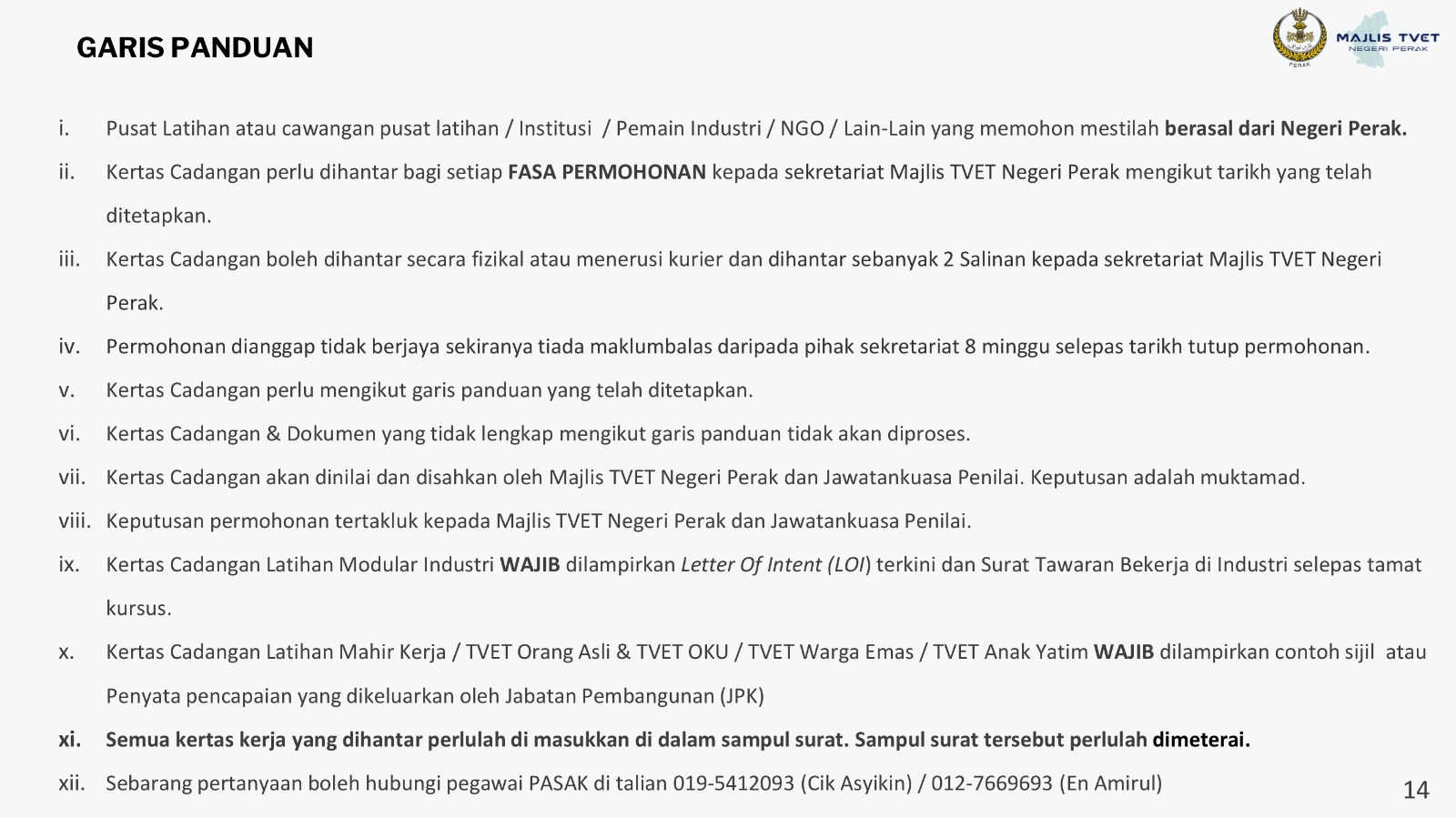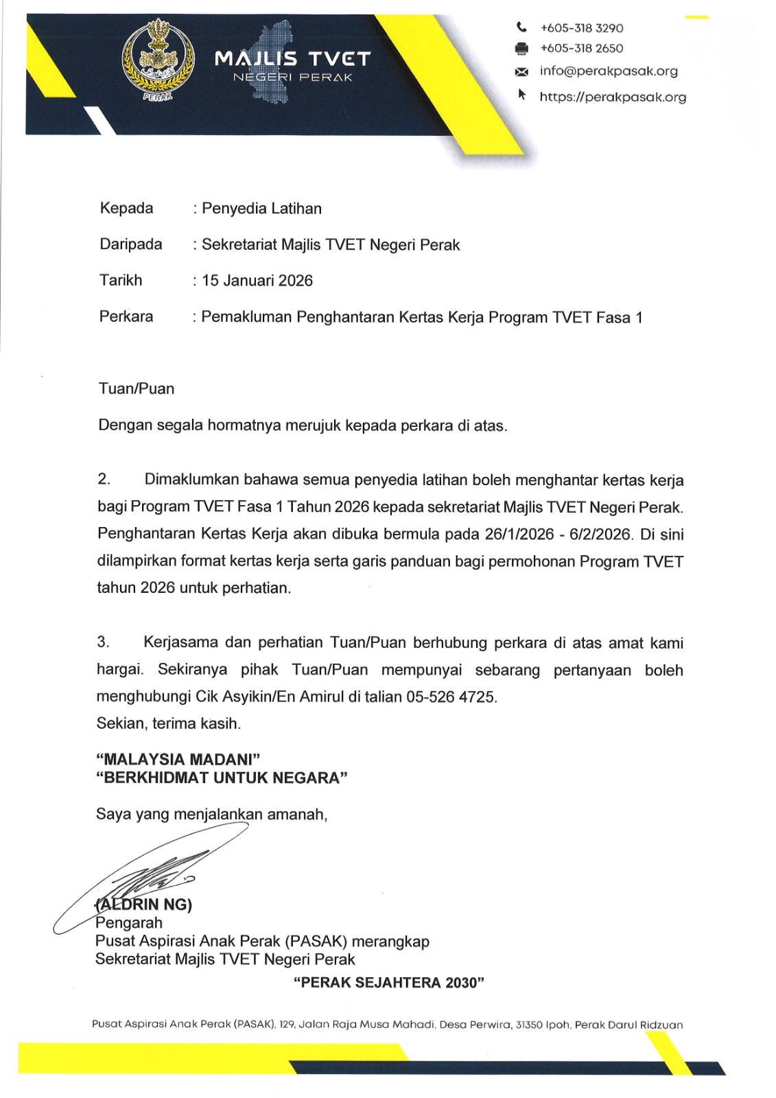 Dimaklumkan bahawa semua penyedia latihan yang berminat dan berkelayakan dijemput untuk menghantar kertas kerja bagi Program TVET Fasa 1 Tahun 2026. Tempoh penghantaran: 26 Januari – 6 Februari 2026 Semua RFP perlu dihantar mengikut format dan garis panduan yang ditetapkan. Untuk sebarang pertanyaan atau maklumat lanjut, sila hubungi Cik Asyikin atau Encik Amirul Zahir di 05-318 3290.