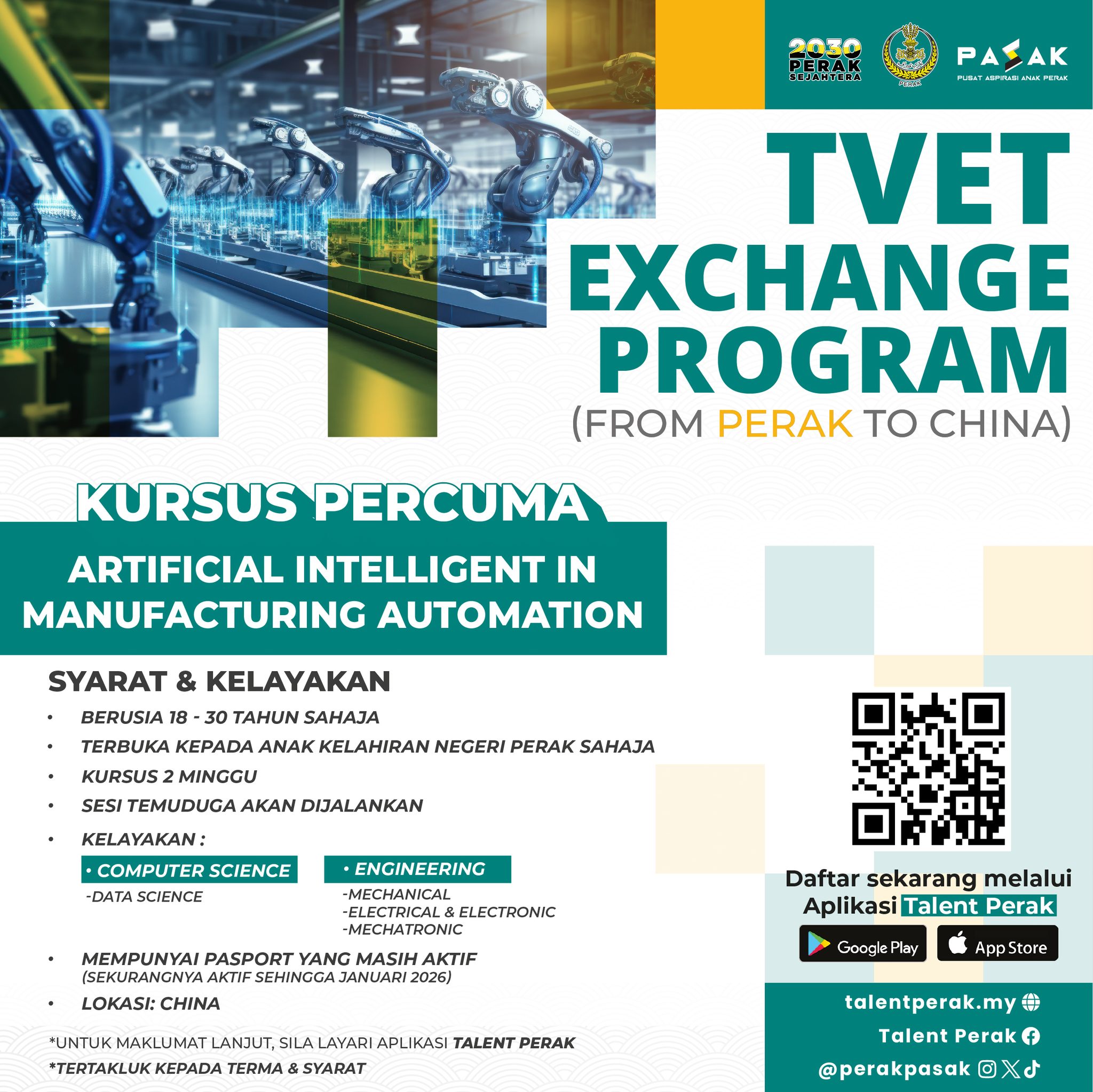 Pusat Aspirasi Anak Perak (PASAK) membuka peluang eksklusif kepada anak jati Negeri Perak untuk menyertai TVET Exchange Program ke China dalam bidang berimpak tinggi iaitu Artificial Intelligence (AI) dalam Manufacturing Automation.